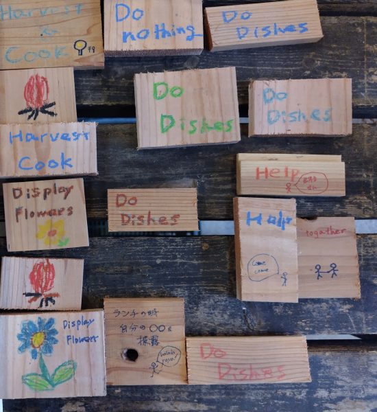役割り分担:食事に向けて役割りを分担。木札選び。花摘みや何もしない人をつくり、寛容な場作り、協働する時間とする。